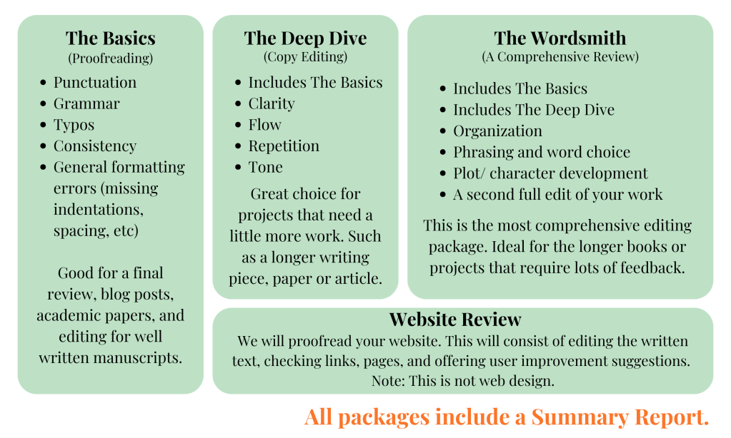Do you have a big project or something that needs a comprehensive review? This wordsmith can wield both a pencil and an eraser! This package includes everything from The Basics and The Deep Dive. This package includes an overview of the organization of your text, plot development, character development, suggestions for alternative phrasing or word choice, and more. It includes two edits.